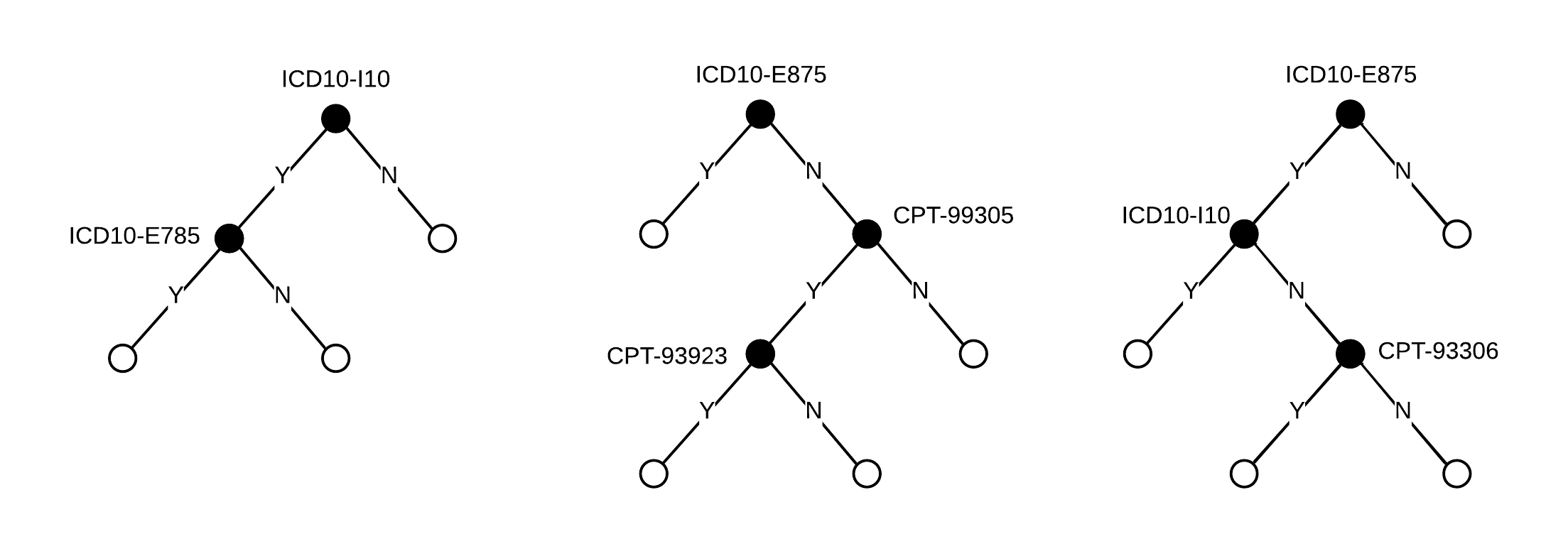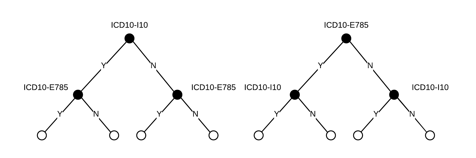 The weight approach count the total splits for each feature: e.g. ICD10-I10 occurred in 1 split and 1 split in each of tree1 and tree3; then we the weight for ICD10-I10 will be 2. The frequency for ICD10-I10 is calculated as its percentage weight over weights of all features. In this 3-tree example, weights are ICD10-E785: 3 (0.375), ICD10-I10: 2 (0.25), CPT-93923: 1 (0.125), CPT-99305: 1 (0.125) and CPT-99306: 1 (0.125), while all other features got weights of 0.