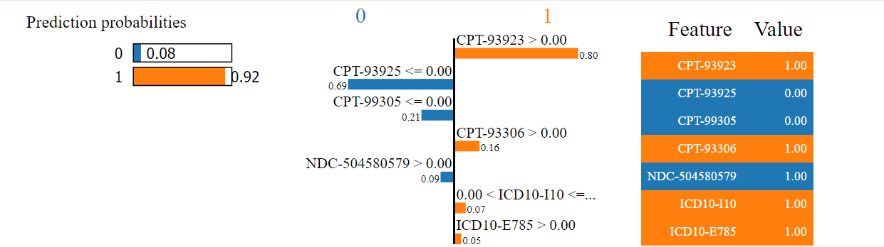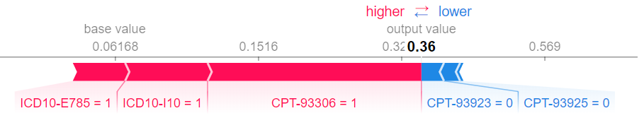 Blue bars mean the feature contribute negatively while red bars mean positive effects. The longest red bar is CPT-93306, the patient is under Echocardiography procedures which increase his probability of vascular disease by about 0.2. The longest blue bar is CPT-93923, which shows the patient is missing extremity arterial procedures which reduce the probability by about 0.05.