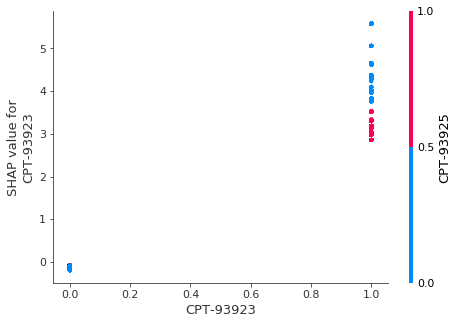 Take these highly correlated variable as example: the dependency plot base is CPT-93923 where CPT-93923 = 1 positively contribute to the target. However on the positive side, when CPT-93925 = 1, it diminishes the effects from CPT-93923, which makes sense that in additive tree models correlated variables might not hurt performance but they work against each others.