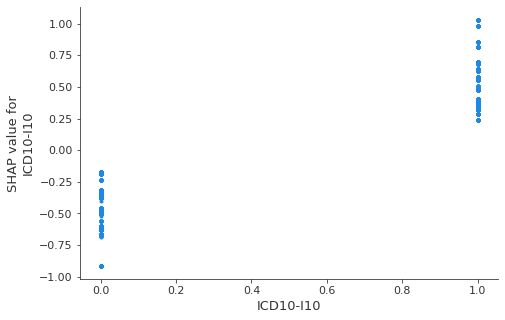 shap.dependence_plot('ICD10-I10', shap_values, data[columns[:-1]], interaction_index=None, show=False)