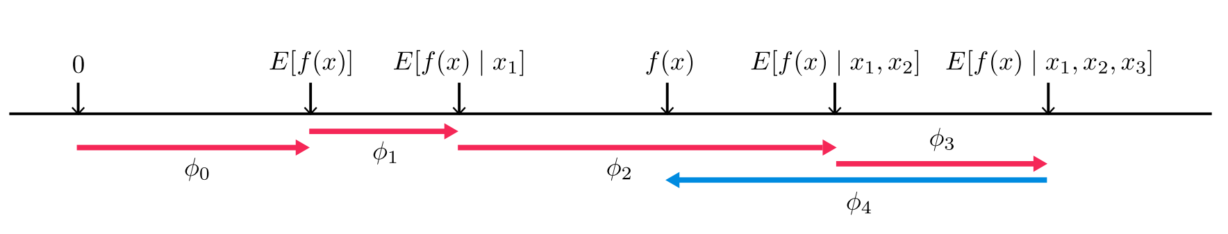 - Then according to the order of $S$ we add feature $x_2$, here $\phi_2=f_x({x_1,x_2})-f_x(\emptyset)=E[f(x)\vert x_1,x_2]-E[f(x)]$, which means expectation value of model prediction with both $x_1$ and $x_2$ - expectation value of model prediction with $x_1$;