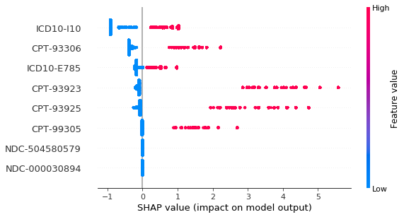 We can see the CPT-93923 and CPT-93925 (extremity arterial procedures) are both vital important feature: they are basically positively related to vascular disease, which means most people who received such procedures are generally having vacular disease gap. ICD10-I10 (essential hypertension) is also an important feauture: patient with hypertension possibly having risk of vascular disease while on the other hand, all negative SHAP values are blue dots which means patients without hypertension are free from vascular disease.