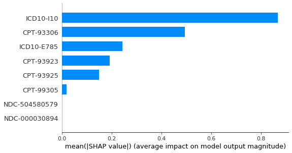 Compared to gain above, the contributes from ICD10-E785 significantly increased, probably because it is used for tree split the most, but those splits do not significantly increase model scores: we can interpret it as there are many patients having hyperlipidemia; people with actual vascular disease most likely have hyperlipidemia but people having hyperlipidemia not necessarily encounter vascular disease.