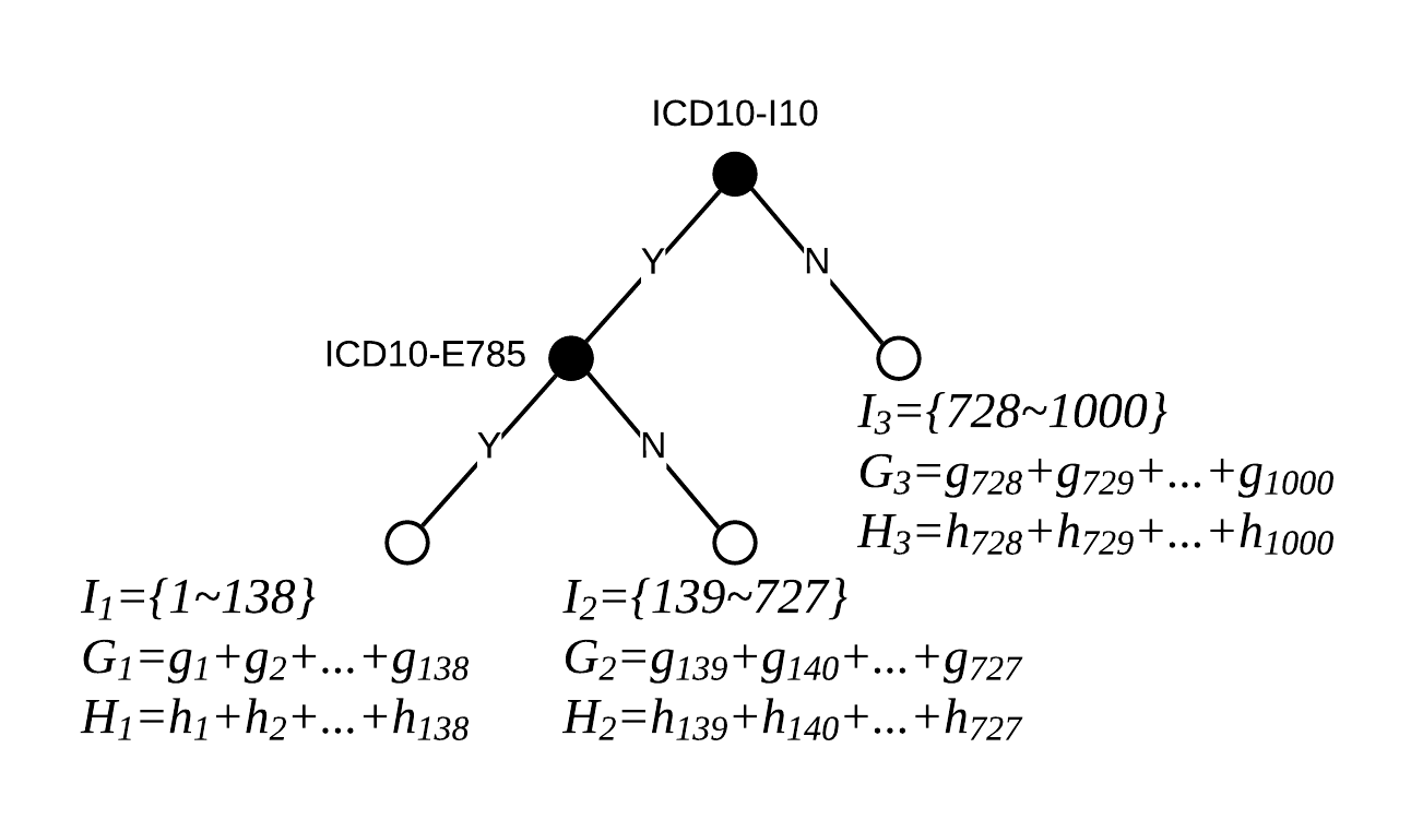 \[\begin{align} \mathcal{L'^{(1)}}^{(t)} &= \sum^T_{j=1} [G_j + (H_j + \lambda) w^*_j ] = 0\\ w_j^\ast &= -\frac{G_j}{H_j+\lambda}\\ \mathcal{L'}^{(t)*} &= -\frac{1}{2} \sum_{j=1}^T \frac{G_j^2}{H_j+\lambda} + \gamma T \end{align}\]Taking the tree1 from above as an example, suppose the tree split the 1000-sample dataset as: